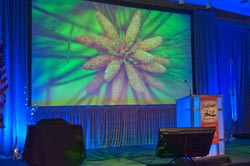 screen draped in gray velvet counter-balancing the podium with lots of brilliant